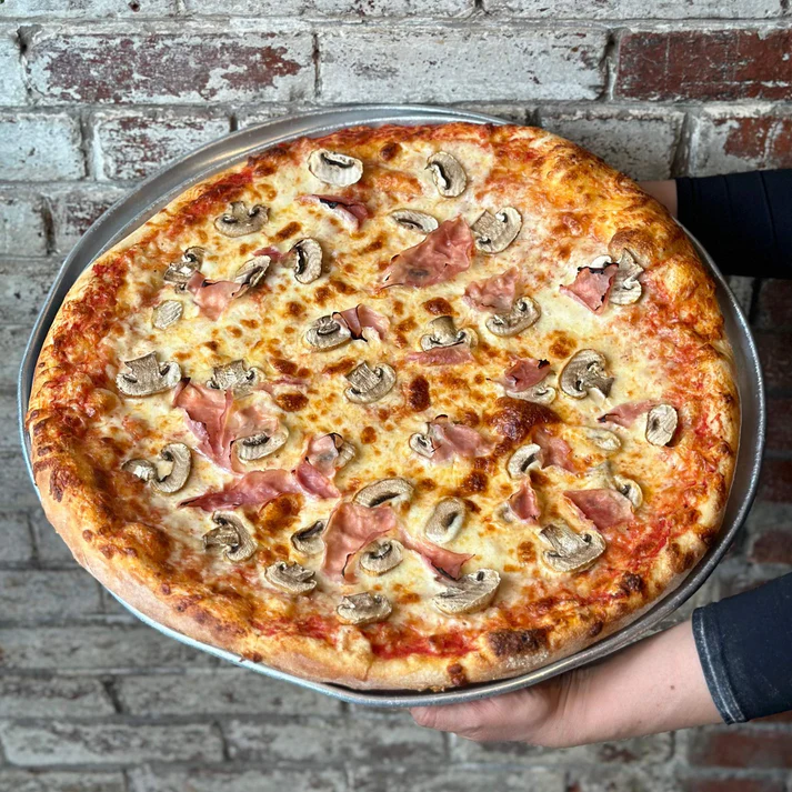 Napoli base, ham, salami, mushroom, capsicum, onion, olives, spinach, chilli flakes, mozzarella cheese